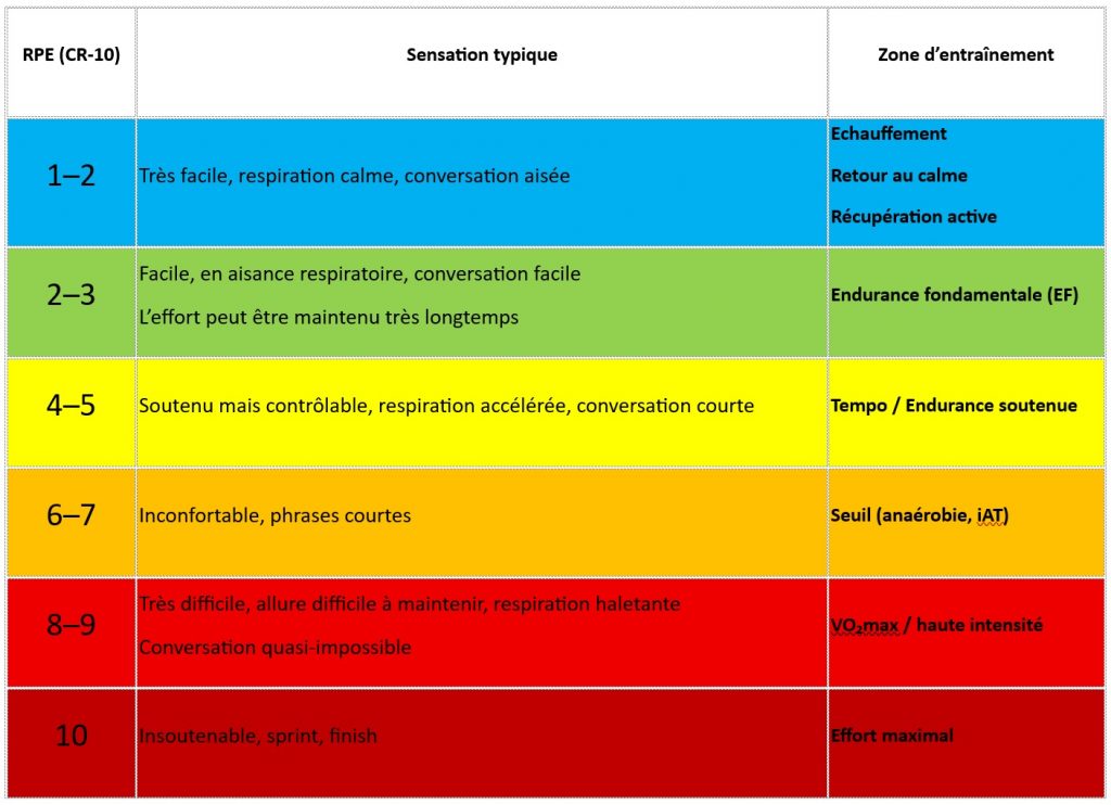 Le RPE est un outil simple et fiable pour mesurer la perception de l’effort, utile à la fois pour prescrire (pendant) et pour quantifier la charge interne (après).